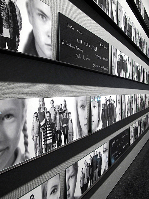 This project began with a fascination for growth and change of children. I made it with pupils of one class in the city of Tampere during the period 2001–2009. It is a sisterwork to I am #1, 2006. The project yielded two installations of numerous parts, layered portraits and an artwork in neon light. The overall subject is the person’s being and identity.